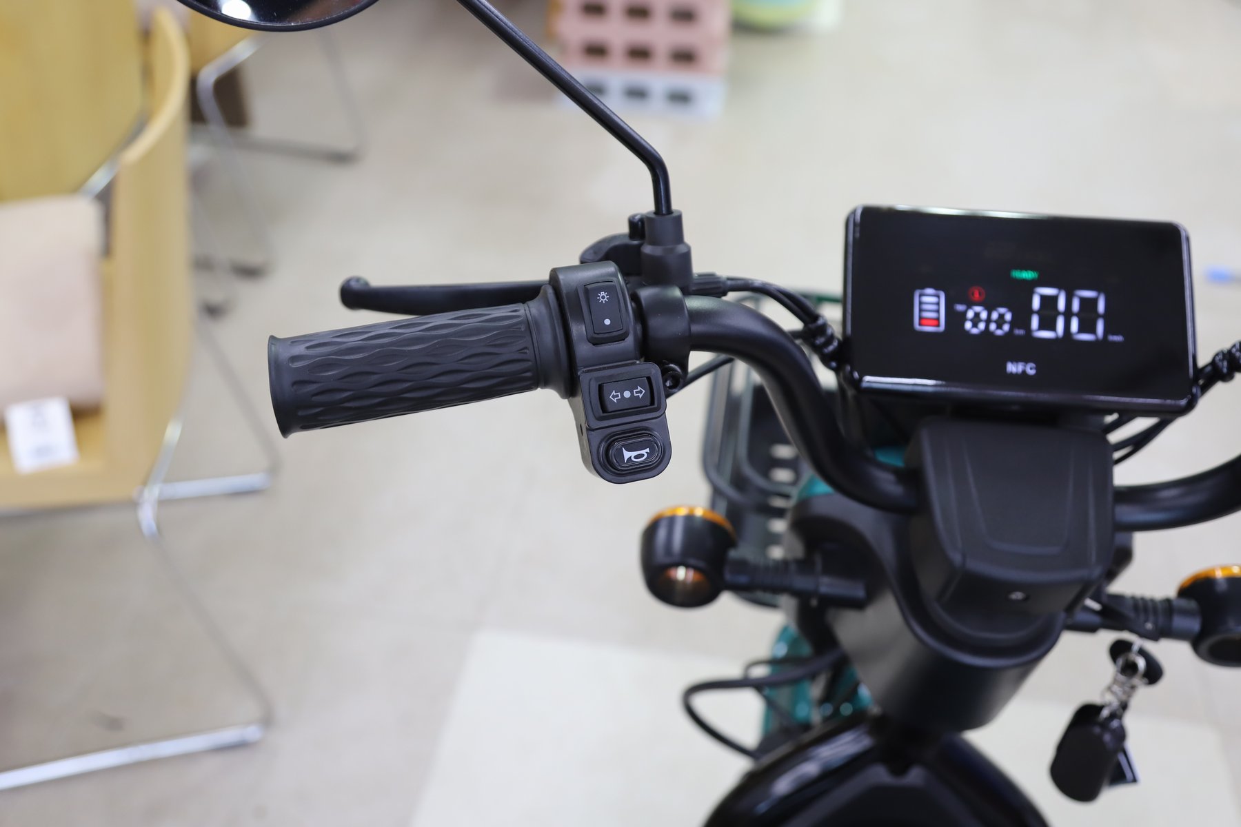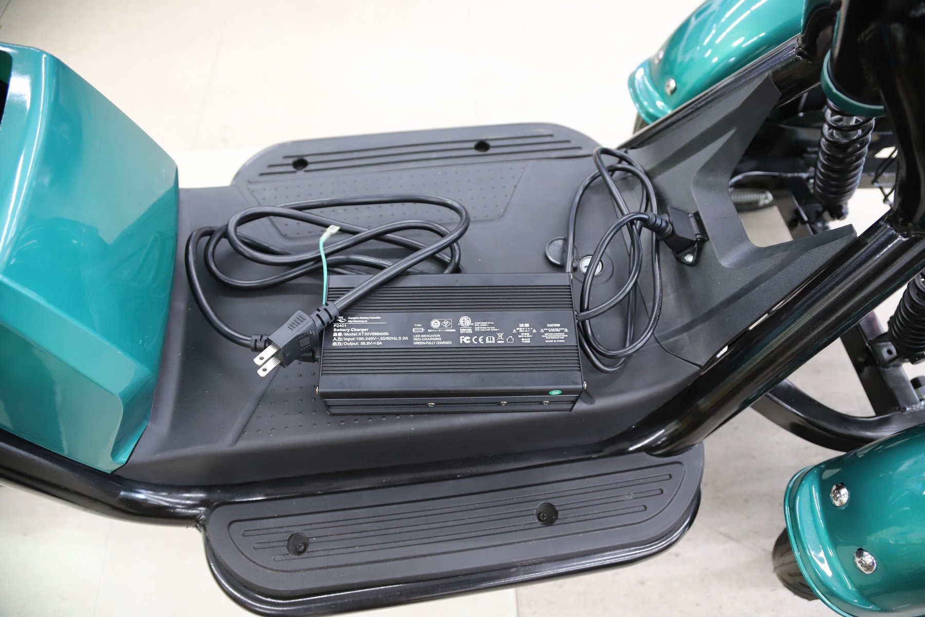 - ご自宅のコンセント(AC100V)で充電OK! フル充電時間は約4~5時間、フル充電で約30km走行可能です。